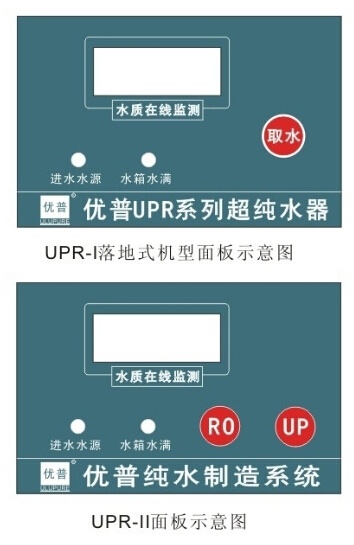 (6)輕按控制面板“RO”取水按鍵或“UP”取水按鍵,便可從主機(jī)取二級RO純水和UP超純水。(UPR-II機(jī)型)